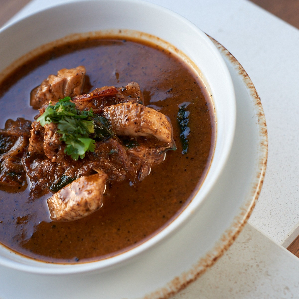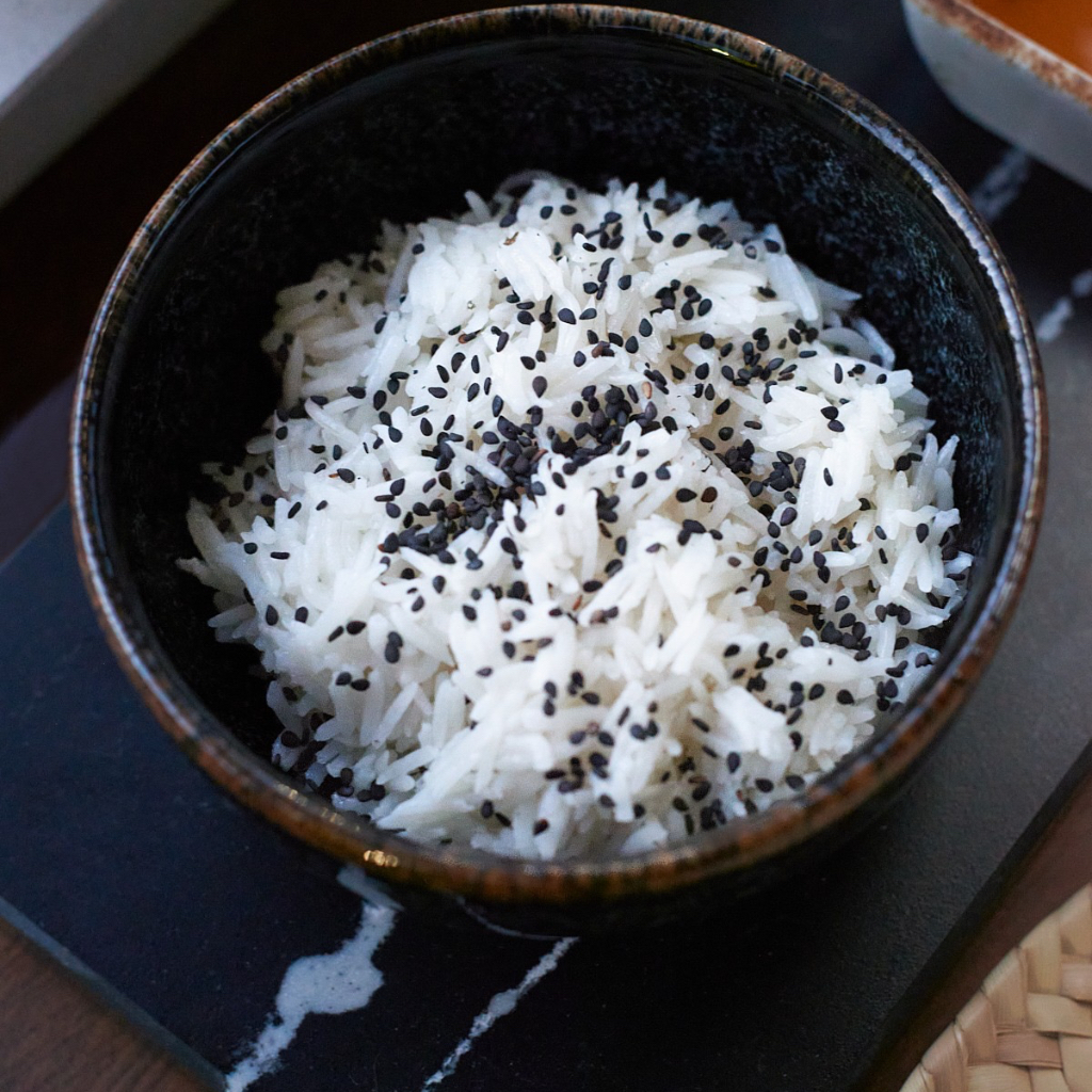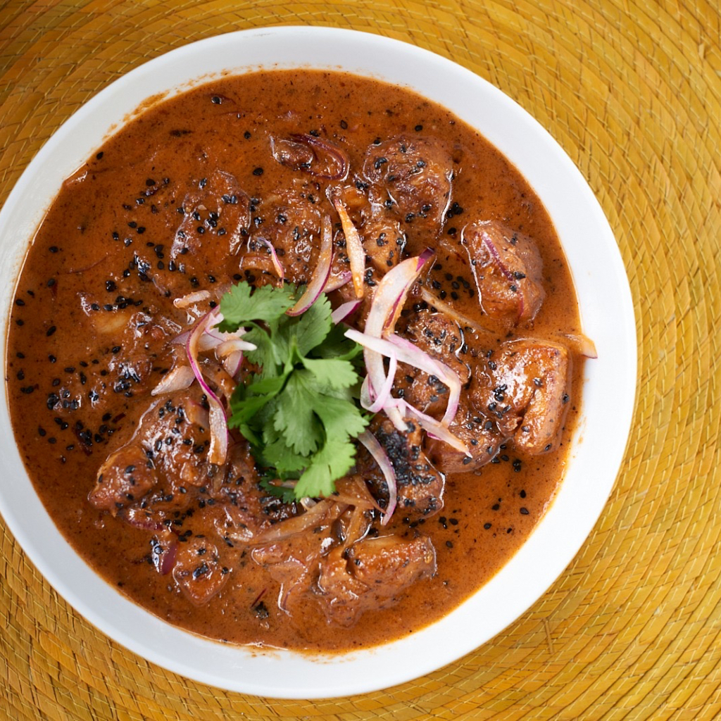 Trozos de pollo en salsa de jitomate y crema servido con arroz bastami